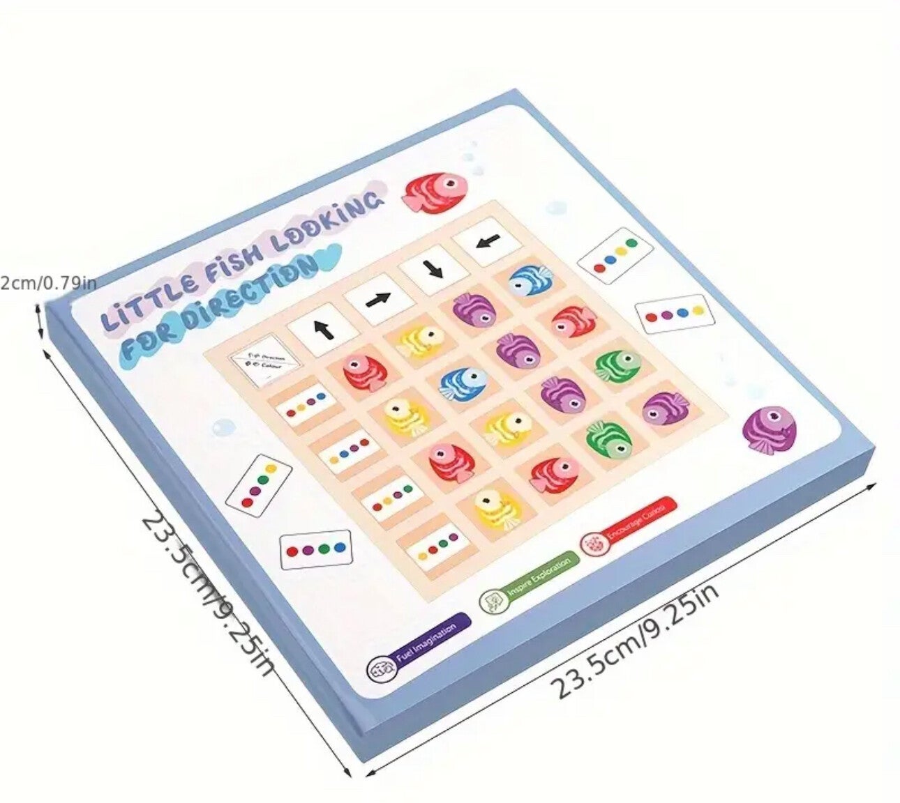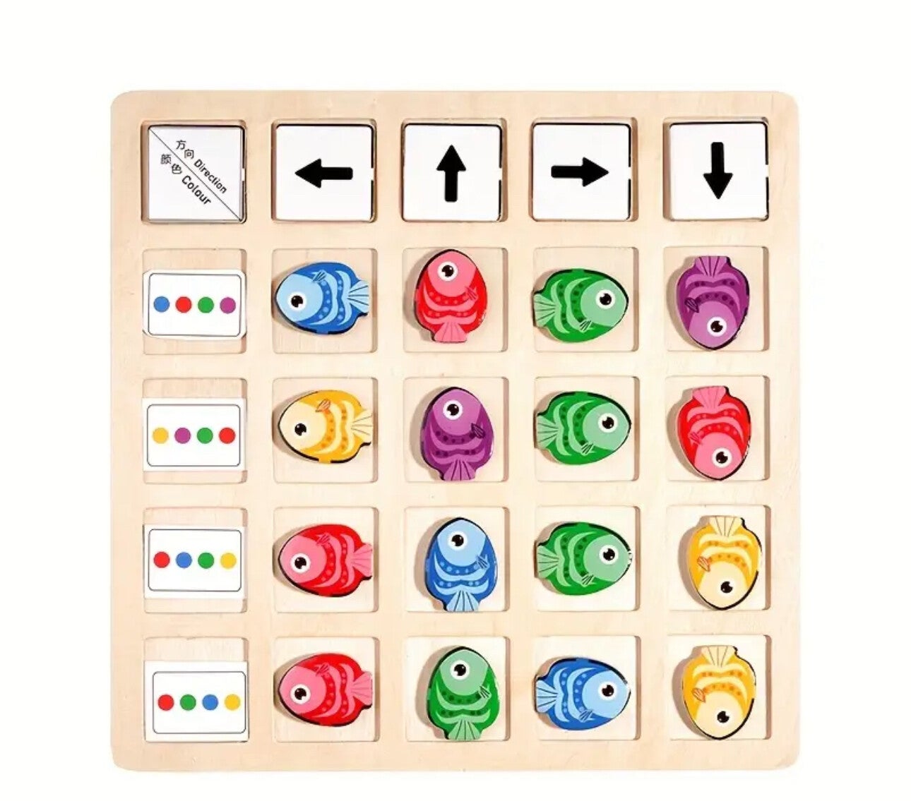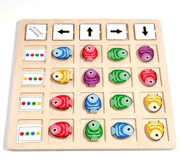 De vis moet op bepaalde kleuren volgorde gelegt worden en aan de bovenkant met de pijlen kun je aangeven hoe de vis moet liggen. Leuk voor alle leeftijden.